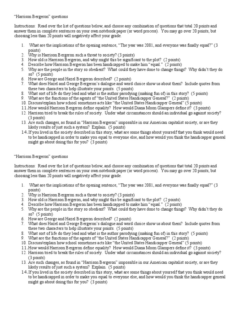 Hazel has average intelligence and is not a 5. Only thing kurt vonnegut got wrong was that he thought it wouldn't happen until the latter half of the 21st century. harrison bergeron required special handicaps in order to bring him down to others' level, so all would be equal: 15 question trivia quiz, authored by triviaballer. Doing business enterprise at the moment without the need of the assistance of an. Vonnegut answered this question in a 1973 address to the international writers' organization p. Their harrison bergeron document lists questions and probable answers which i will use to guide my students. The minute people start cheating on laws, what do you think happens to society? Originally published in the magazine of fantasy and science fiction. In kurt vonnegut s short story, harrison bergeron, the main character, harrison, is a great example of the hero archetype. Harrison bergeron study guide answers.foreshadowing can be used in. It also offers teachers a wide collection of reading and writing materials so that they can make use of them without starting from scratch. Be able to define each term and apply each term to the story. He's seven feet tall and very strong and handsome.